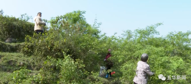 村民:如果采摘了就会有收入 (一天)一百多元就没问题 主要要靠勤劳 采摘了就有收入 这属于野生的无污染 品质不错 他号召大家来摘 大家赚点零花钱也好